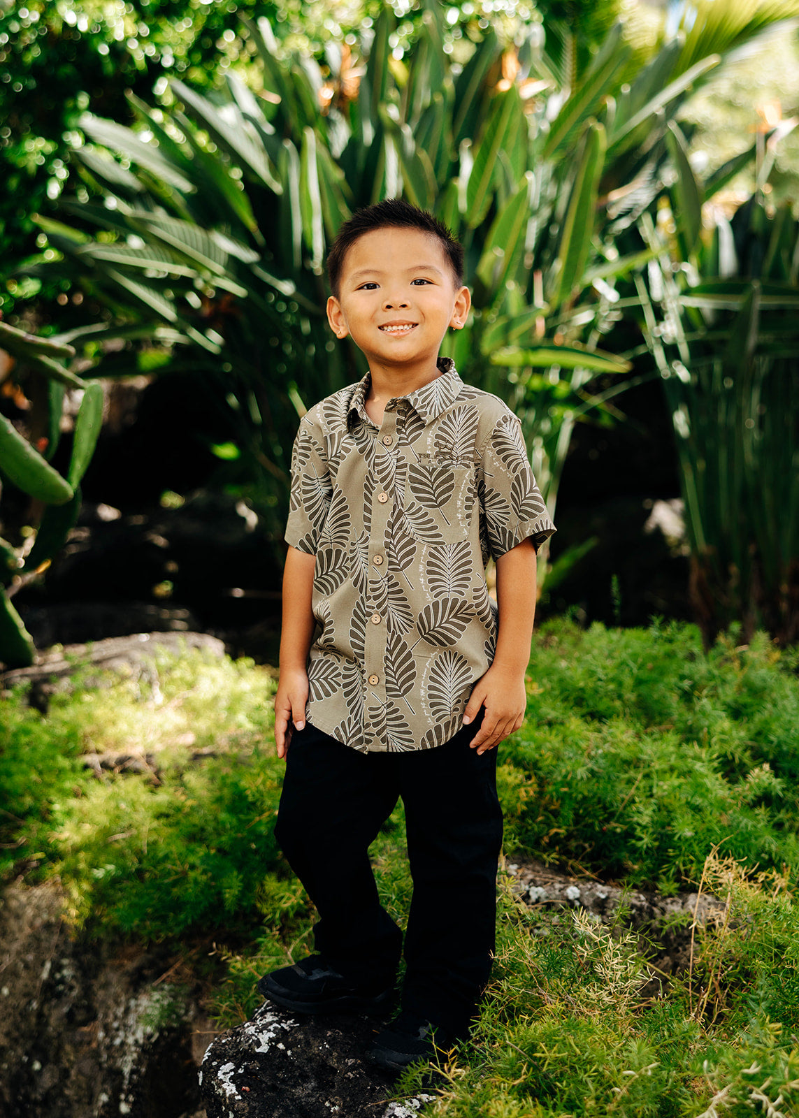 Blessed lightweight button down aloha shirt with embroidered Blessed logo on pocket. In an olive colored leaf print with the scripture James 1:4