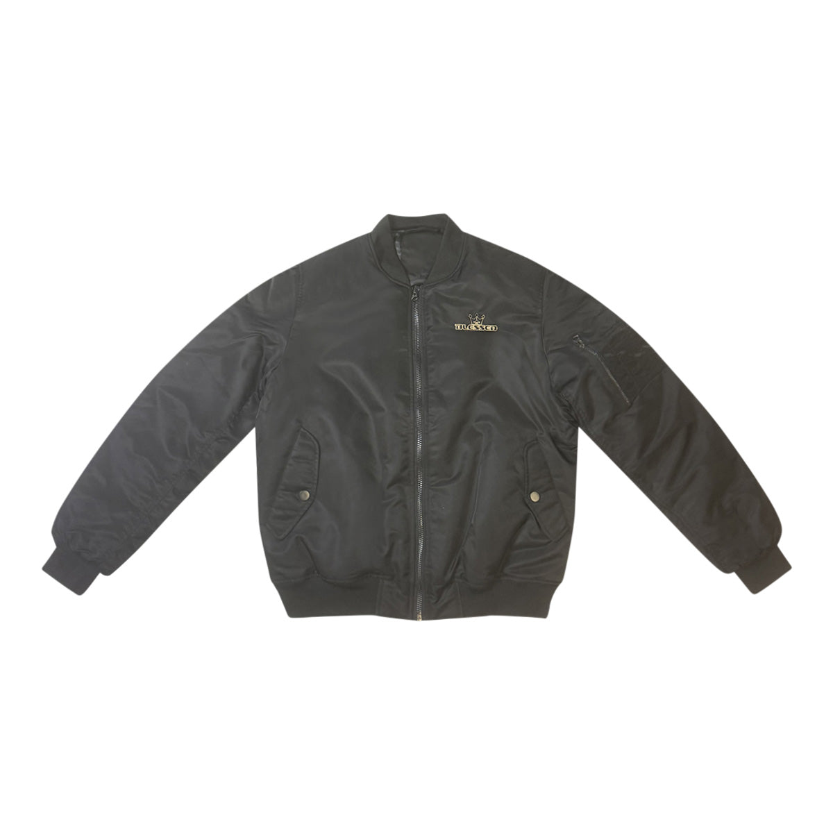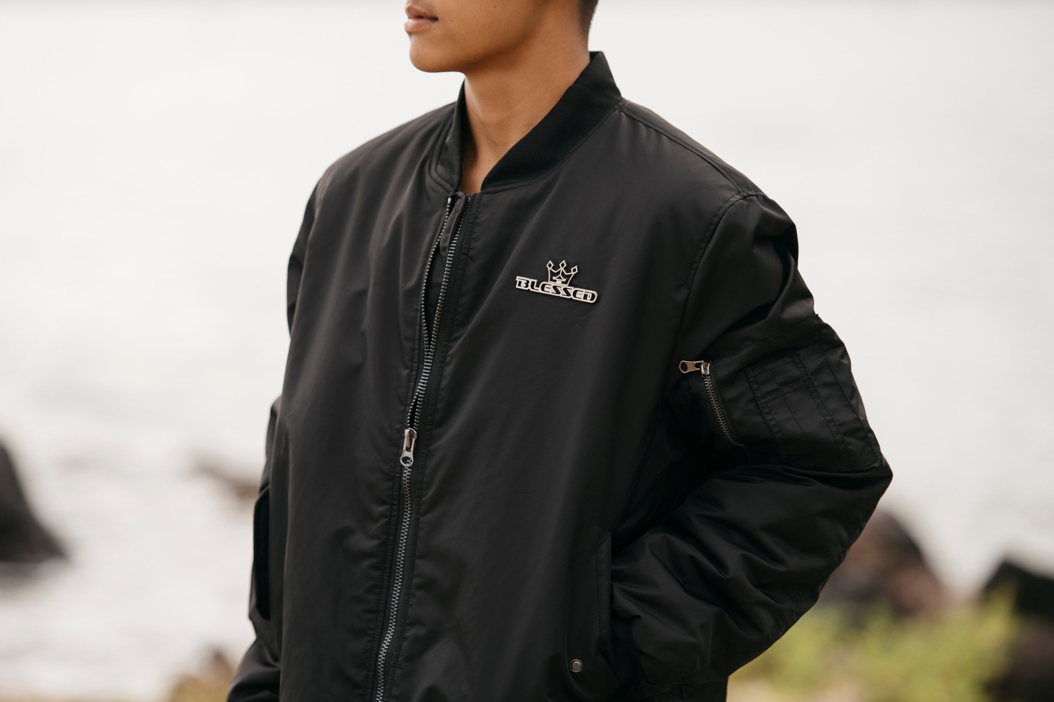 Our black puffer jacket with full zipper closure and high collar design, features side 2 snap pockets for essential storage, stand-up collar, solid color, zip sleeve pocket and oversized style, metal BLESSED logo on chest - windproof and warm.