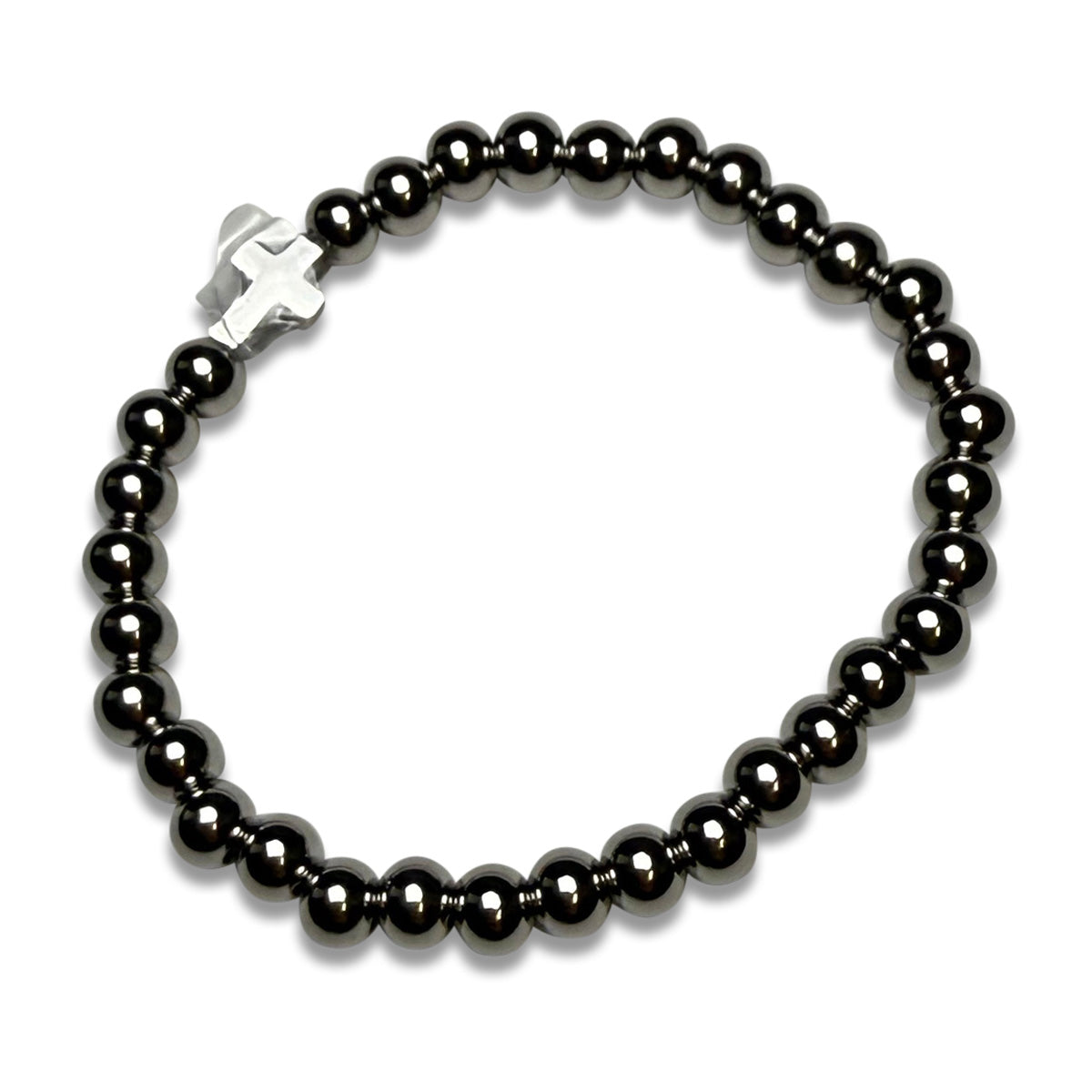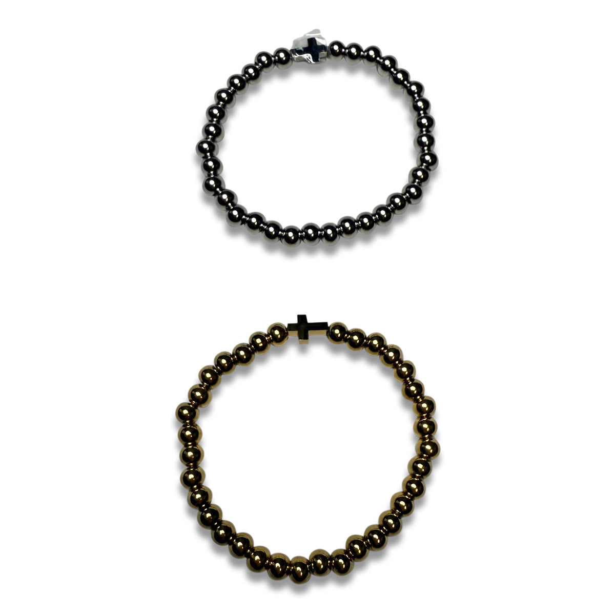 Stainless steel beads with a cross. Elastic band, durable. Available in Gold and Silver.