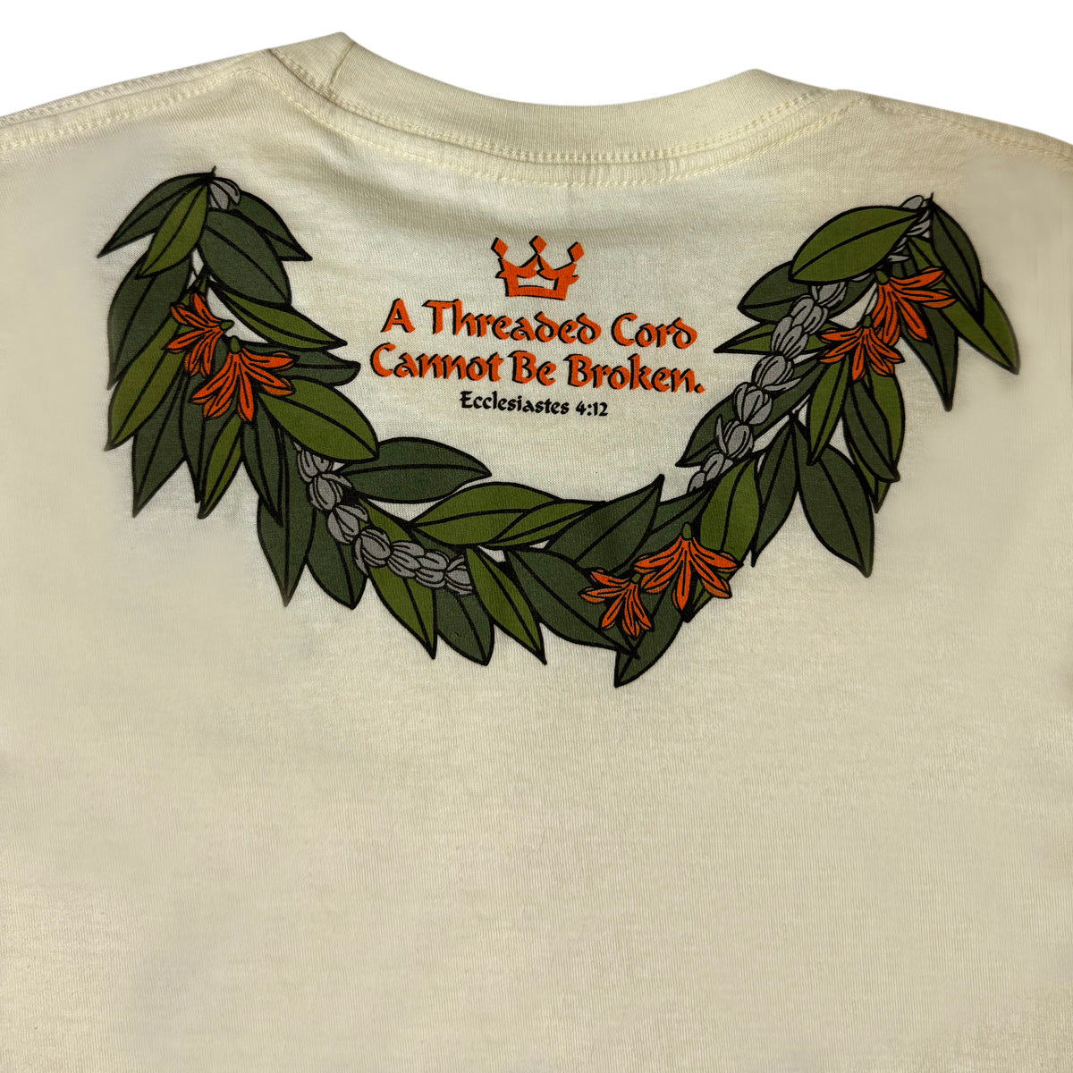 Scripture on back neckline reads: A threaded cord cannot be broken. Ecclesiastes 4:12 🪢